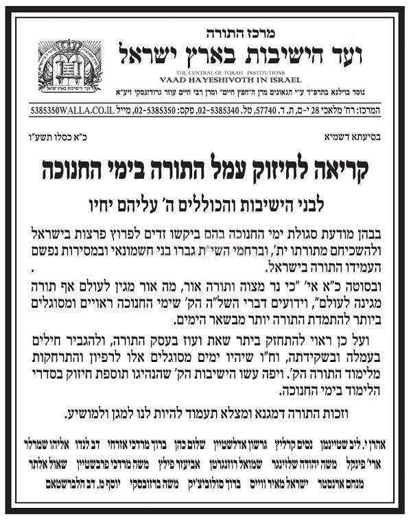 Les plus grands rabbins israéliens ainsi que les membres du Conseil général des Yéchivote, ont signé un appel spécial pour les étudiants des Yéchivote et des Kollélim (structures d'enseignement pour les jeunes gens mariés), les incitant à renforcer leur étude pendant la période de Hanoukka.