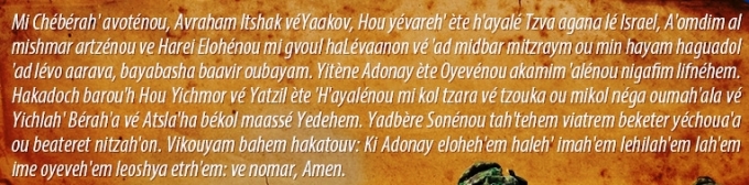 Prions dans notre Téfilote quotidiennes, mais également les Lundi et Jeudi pendant l'ouverture du Hekhal (arche sainte). Prions afin que les 'Hayalim réussissent dans tout ce qu’ils entreprennent, et que leurs ennemis tombent dans leurs mains, « que l’épée de leurs ennemis se retourne dans leurs cœurs, et que leurs arcs se brisent », qu'ils rentrent chez eux en bonne santé, et qu’ils aient le mérite de s’élever dans la Torah et la Crainte d’Hachem.