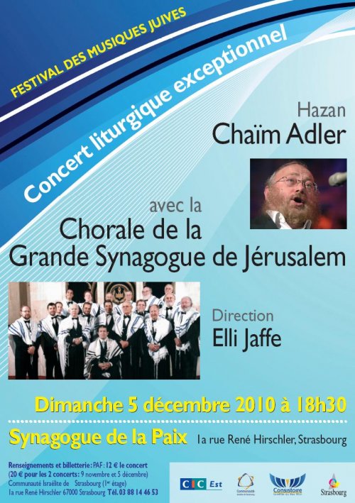à la Synagogue de la Paix à Strasbourg, concert liturgique avec le Choeur de la Grande Synagogue de Jérusalem dirigé par Elli Jaffé, avec la participation du cantor Chaïm Adler.