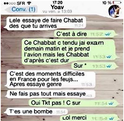 C’est le site Thora Box qui a révélé cette photo et qui selon le responsable du site, fut la dernière conversation de Yoav Hattab, tué lors de l’attentat au Hyper Cacher de Vincennes : » Comme si sa Néchama pressentait un départ de ce monde, il est parti pur, encourageant une amie à respecter Chabbath… »