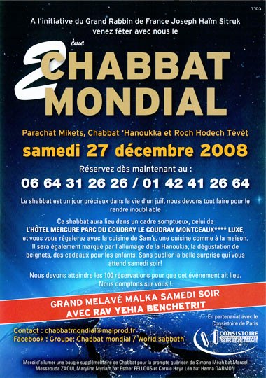 « LE SHABBAT MONDIAL » le YOM CHABBATONE du Vendredi soir 26/12/2008 au Samedi soir 27 Décembre 2008 Chabbate Hanoukka