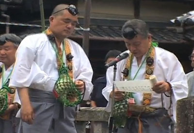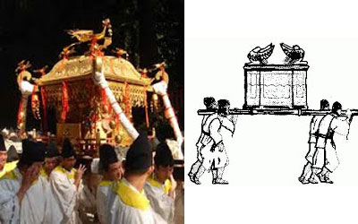 Le prêtre principal prononce ensuite des incantations sacrées et appelle le kami à s'incarner dans le mikoshi. Il scelle enfin le mikoshi, qui est ensuite transporté à travers tout le quartier pour attirer la bénédiction divine. Il convient de signaler qu’en haut du Mikoshi trône un oiseau aux ailes déployées. On se souvient que les chérubins qui ornent l’arche de l’Alliance déploient également leurs ailes, que l’arche est portée à dos d’homme grâce à deux poutres glissées dans des anneaux et qu’enfin, l’Arche d’Alliance renferme les tables de la Loi données à Moïse sur le Mont Sinaï. La ressemblance est frappante, si ce n’est qu’un chérubin s’est perdu en route dans le Mikoshi. "Et tu feras deux chérubins en or ; tu les forgeras aux deux extrémités du propitiatoire. Fais un chérubin à une extrémité, et l'autre chérubin à l'autre extrémité" (Exode, chapitre 25 versets 10 à 21).