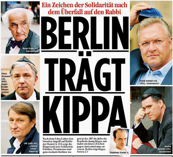 a publié la photo de la une du Berlins Gross Zeitung, un quotidien allemand. En signe de solidarité avec le rabbin qui a été molesté par des jeunes à Berlin, de nombreuses personnalités allemandes ont choisi de porter la kippa. Le rabbin a été attaqué dans une rue de Berlin par quatre jeunes alors qu’il se promenait avec sa petite-fille de 4 ans.