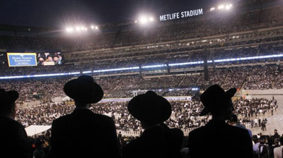 Une Mechitza énorme – séparation entre les hommes et les femmes lors de la prière – a même été mise en place dans la partie supérieure du stade. Des rideaux verts ont été placés pendant la prière puis retirés lors des discours et célébrations. En milieu d’événement, les participants ont formé des danses de joie. Sur les gradins, se formaient d’immenses cercles de danses sur des chants traditionnels.