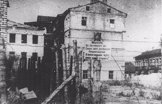 Photo : Une pancarte fixée à la clôture de fil de fer barbelé qui encercle le ghetto de Minsk déclare : “Avertissement. Quiconque escaladera la clôture sera abattu !” Union soviétique, 1941