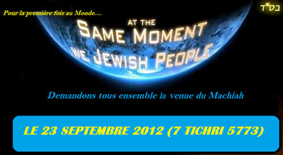 La Phrase que devront dire les français le 23 septembre à 17h00 précise est la suivante (sans oublier de mettre une pièce à la Tsédeaka ) : « Maitre de l’Univers, nous, enfants d’Israël te demandons le Machiah afin de nous délivrer maintenant de cet exil et de nos souffrances et que ton nom dans le monde amène la Paix » Vous pourrez aussi découvrir dans la minute 10:15 de cette vidéo un message de l’ancien Grand Rabbin de France, Haim Joseph Sitruck qui confirme que cet événement ne doit pas être oublié de votre agenda !