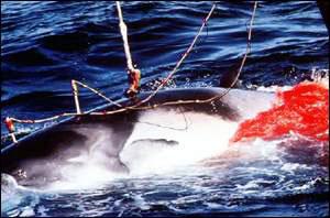 Par contre, une très cruelle chasse à la baleine est permise en Norvège. L'année dernière, la Norvège avait institué un quota de 1000 baleines, faute d'avoir trouvé les 1000 les chasseurs se sont contentés de 500.