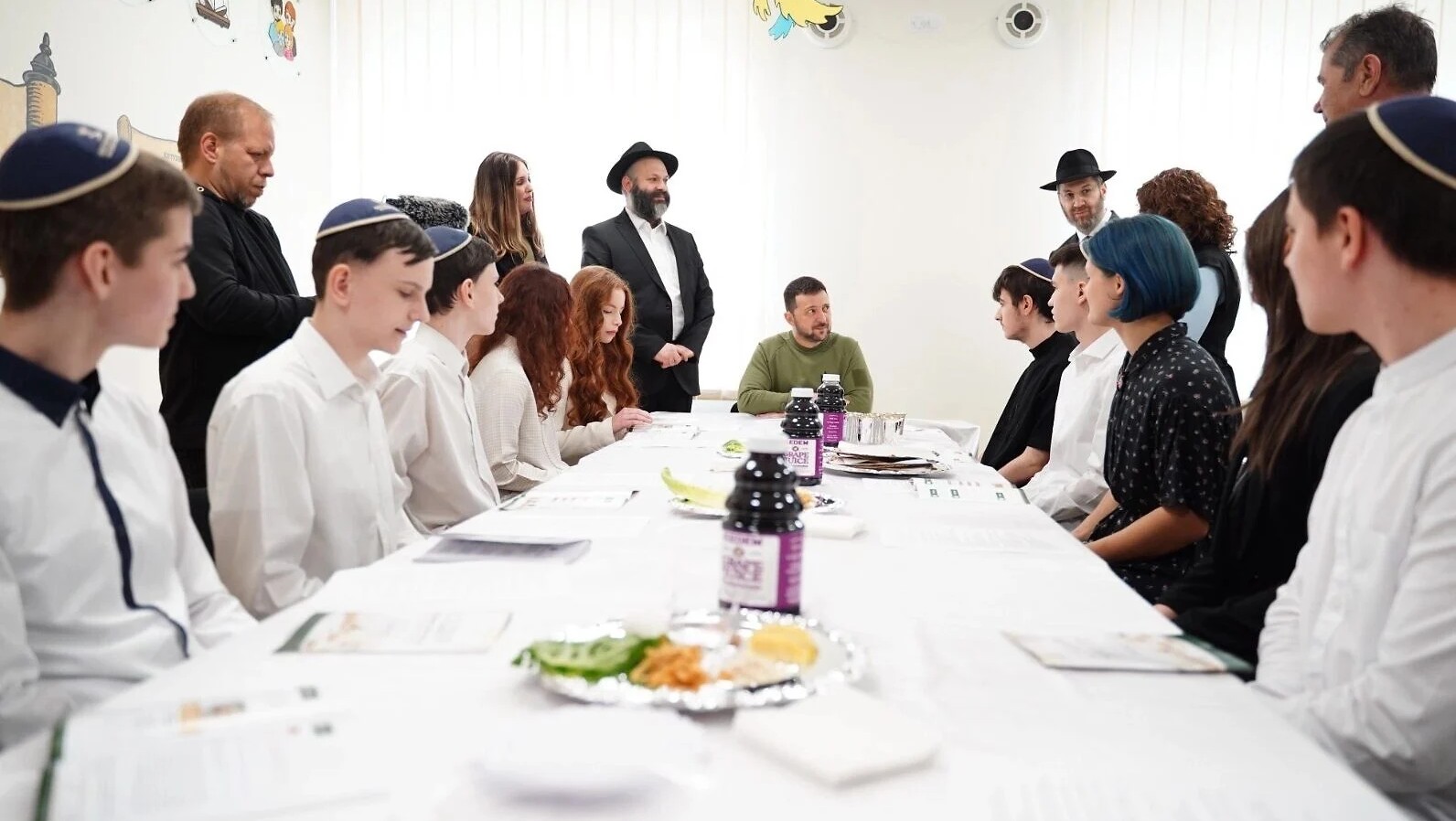 Volodymyr Zelensky avec des étudiants de l'école Sim'ha à Kiev à l'occasion d'un pseudo-seder de Pessah. (2024.FJCU/JTA)Mais c’est un autre moment qui a marqué les esprits. Au cœur des célébrations, plusieurs soldats juifs engagés sur le front ont obtenu une permission exceptionnelle. Ils ont quitté, pour quelques heures, les lignes de combat pour venir s’asseoir à la table du Séder aux côtés de leurs familles et de leur communauté.