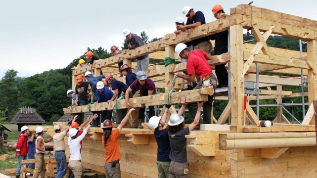 Tout le travail pour recréer le toit et le plafond de la synagogue a été fait à la main, avec des rotations d’équipes d’étudiants de partout dans le monde qui ont travaillé sur les conseils d’artistes qualifiés en utilisant des méthodes, des outils et des matériaux qui ont été utilisés à l’époque où l’original a été fait. La reconstruction du toit a été menée par l’International Timber Framers Guild.