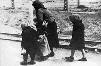 Vielle femme et ses petits enfants vers les chambres à gaz