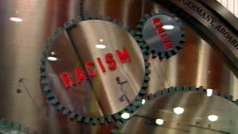 Rappelant le mécanisme d'une horloge, des mots comme racisme, xénophobie et antisémitisme n'y sont inscrits que dans une seule des deux langues officielles du Canada, soit l'anglais.