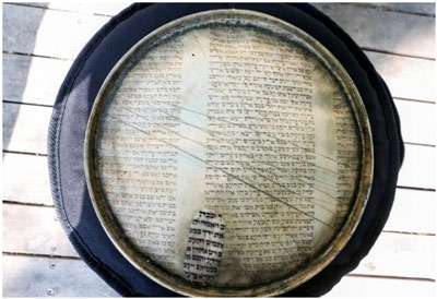 Un tambour fait avec des parchemins de la Tora par les nazis