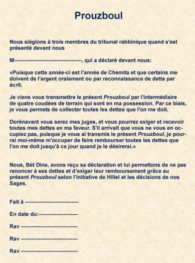 ![]() Toutefois, ce n'est pas d'une Mitsva durant toute l'année qu'il s'agit, mais d'une annulation tombant à un moment précis, le dernier moment de l'année de Chémita (bien que selon certains avis, ce soit la première minute de cette année-là, mais la majorité des décisionnaires a admis que c'est la seconde avant l'entrée du Roch Hachana de l'an suivant la Chémita qui est la date qui nous importe). En conséquence, si vous avez prêté (voir définition plus bas) de l'argent ou tout objet à toute personne que ce soit et que la date de remboursement soit avant Roch Hachana de la huitième année, vous ne pouvez plus le lui redemander après cette date ! ![]() La Michna, il faut le préciser, loue une telle conduite. Attention : cette Mitsva concerne tout Juif, même à l'étranger, puisqu'elle n'est pas liée à la terre (Ch. Ar. `H. M. 67,1 et Séfèr Ha'hinoukh 477, mais le Roch ch. 64 et 77 témoigne du fait qu'en Espagne, on n'accomplissait pas cette Mitsva). Quand nous parlons d'objet, il ne s'agit que d'un objet prêté sans que son ancien propriétaire espère le recevoir identique en retour (un objet comestible que l'on se prête entre voisin ou autre), ce que l'on appelle une "Halvaa". De même, on ne s'attend pas à recevoir les mêmes billets d'argent, mais leur valeur. ![]() Quand il s'agit d'une "Halvaa", l'annulation des dettes la concerne. Bien entendu, quand il s'agit de petits prêts entre voisines, comme une bouteille d'huile ou quelques pommes de terre, l'intervention de l'annulation des dettes n'a pas grand impact. De toutes manières, il est admis en général qu'entre voisins, on n'est pas regardant sur la restitution de ce que l'on a emprunté - car est-on sûr soi-même de se souvenir de rendre les deux tomates empruntées en urgence en veille de Chabbate ? Mais quand on sait qu'on a emprunté, on doit rendre la chose. Mais dans le cas de prêts d'argent, cette Mitsva peut avoir de très lourdes conséquences monsieur le rabbin, j'ai prêté 50.000 euros à mon neveu pour qu'il puisse acheter un appartement - vais je les perdre ? HILLEL Rappelons que si l'on prête en établissant clairement que la date de remboursement sera après Roch Hachana de la huitième année, on peut exiger la somme prêtée en temps voulu. La solution classique, pour des dettes dont la date de remboursement est déjà échue : le " Prouzboul ". Il s'agit simplement de transmettre au Bèt Dine toutes les dettes que l'on a, qu'elles soient orales ou qu'on ait établi une reconnaissance de dette en bonne et due forme, et c'est alors cette institution qui sera responsable de réclamer les dettes à notre place et de les réceptionner. A la limite, nous pouvons obtenir le droit de le faire nous-mêmes - mais en étant dûment mandatés par le Bèt Dine. C'est donc simple ; une simple procédure, voire une déposition banale. Oui, mais quelques points sont à préciser. ![]() Toutefois, certains avis pensent qu'il faut un vrai Bèt Dine, voire un Bèt Dine important dans la ville (Choul'hane 'Aroukh 'Hochèn Michpate chap. 67 par.18). De fait, ces institutions se prêtent au jeu, et il est possible avant Roch Hachana de s'y rendre, et de faire établir un " Prouzboul " devant eux (attention à la bousculade, toutefois). Il est évident que si l'on établit son " Prouzboul " tôt, et que l'on prête de l'argent après coup, le " Prouzboul " ne peut pas servir. Il faut donc l'établir le plus tard possible, ou alors effectivement accepter de prêter de l'argent à perte - et accomplir la Mitsva telle que la Tora nous l'a ordonnée, ce qui n'est pas forcément une mauvaise affaire... Du reste, le Bèn Ich 'Haï écrit que certaines femmes à Bagdad avaient l'habitude d'emprunter une miche de pain avant Roch Hachana et de déclarer, quand la voisine venait la rendre après la fête : "Je n'accepte pas, car la Chémita a annulé cette dette !" Réclamer la restitution des dettes sans avoir établi de " Prouzboul " correspond à une transgression de la Mitsva, et de plus, l'argent récupéré est considéré comme de l'argent volé ! Il faudra le rendre, et même le Bèt Dine pourra forcer à cela. Une dette dont l'échéance tombe après Roch Hachana de début de la huitième année n'est pas soumise à l'annulation des dettes. Il en sera de même pour un prêt sur gage, si le gage équivaut entièrement à la valeur du prêt (sinon, il y a divers avis parmi les décisionnaires). Des arriérés de salaire sont considérés comme prêt, en particulier si une partie du salaire a déjà été acquittée et que le patron demande que le reste soit considéré comme un prêt. Dans ce cas, il vaut mieux avoir fait un " Prouzboul " pour pouvoir les réclamer plus tard, sauf si, comme dit, la date prévue entre les deux parties est postérieure à Roch Hachana de la huitième année. Il y a doute quant à de l'argent payé par un chèque non encore présenté à la banque, et il vaut mieux pour cela également avoir établi un " Prouzboul ". Téléchargez le document du "PROUZBOUL" en PDF . Le texte est extrait du Kountrass News août 2008 |