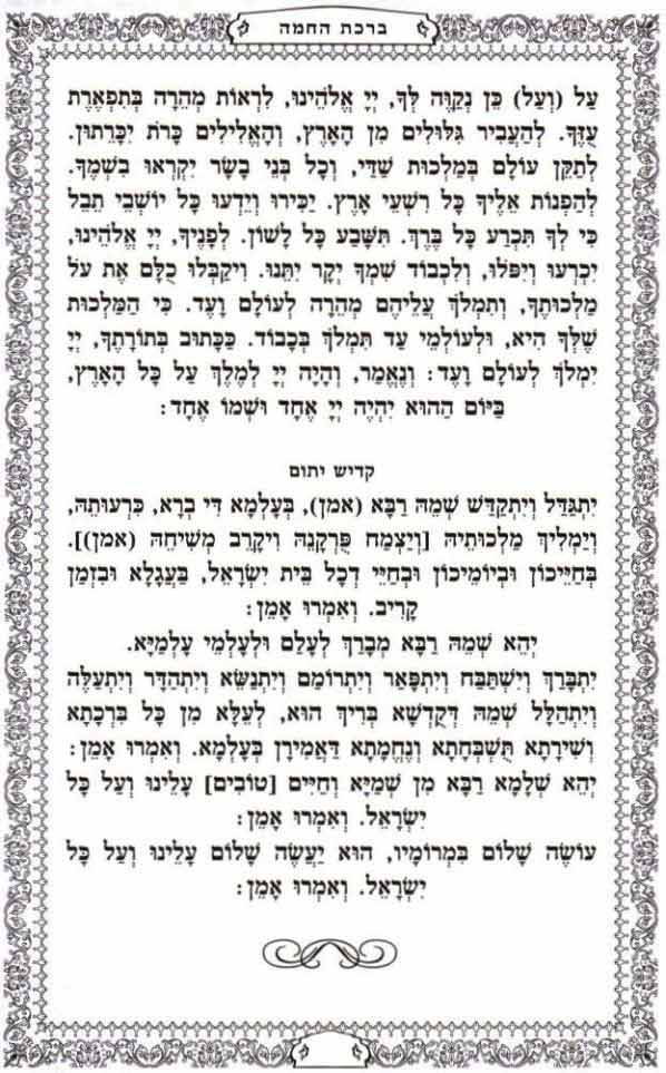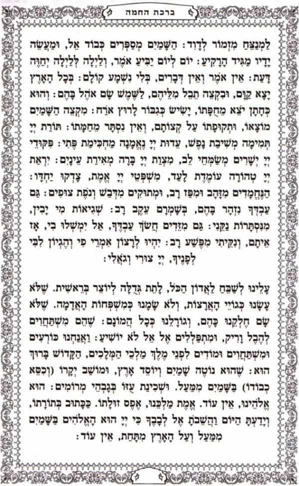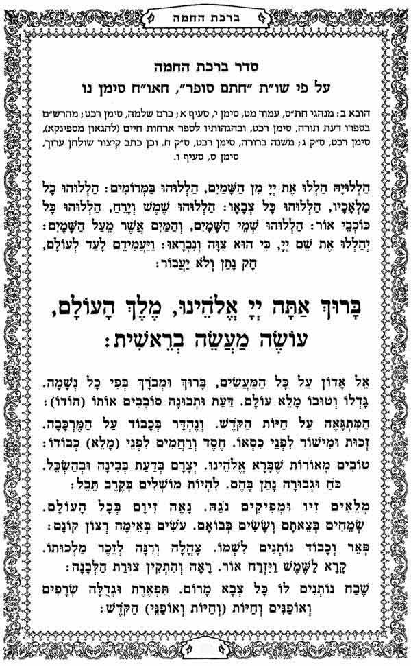 1) Si toutes les conditions évoquées précédemment sont réunies, on fera la bénédiction suivante : « Baroukh Ata Ado-naï Elo-hénou mélèkh Ha’olam ‘Ossé Ma’assé Béréchite ». ![]() 2) On a l’habitude d’accompagner cette bénédiction d’un rituel particulier. De nombreux Minhaguim existent à ce sujet. Vous trouverez ci-dessous le texte du rituel composé par le ‘Hatam Sofèr. ![]() ![]() ![]() 3) Ceux qui ont l’habitude de dire ‘Alénou Léchabéa’h après la bénédiction, prendront garde de ne pas se prosterner face au soleil au moment où ils diront Ana’hnou Michta’havim, mais prendront soin de se tourner sur le coté avant de s’incliner 4) Dans certaines communautés, l’officiant dit la bénédiction à voix haute et l’ensemble des fidèles l’accompagne à voix basse. Dans d’autres communautés, l’officiant fait lui seul, la bénédiction à voie haute en ayant l’intention d’acquitter ceux qui l’écoutent et l’assemble des fidèles répond Amèn avec l’intention de se faire acquitter. D’autres enfin, écoutent l’officiant dire la bénédiction à voix haute puis la répète après lui comme on a l’habitude de faire au moment de Séfitate Ha’omèr. Chacun fera selon son Minhag. ![]() Toutefois, si l’on désire satisfaire toutes les opinions, on prendra soin de revêtir à ce moment là un vêtement neuf ou de manger un fruit nouveau. On fera alors la bénédiction Chéhé’héyanou en pensant à exempter par la même occasion la bénédiction faite sur le soleil. De toutes les manières, il suffira qu’une seule personne dans l’assistance fasse Chéhé’héyanou sur un vêtement ou un fruit et pense à acquitter de la sorte toutes les personnes présentes. |