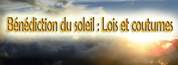 ![]() Birkate Ha'hama précédente au Kottèl en présence du Rav Eliyachiv 5741 (1981) 2) Il convient de faire la bénédiction au moment où l’on voit le soleil la première fois dans la journée. Si l’on ne l’a pas fait, on la fera après l’avoir vu la fois suivante. 3) Si l’on est contraint de faire la bénédiction de l’intérieur de la maison, on devra à priori, ouvrir les fenêtres avant de regarder le soleil. A postériori, si on ne l’a pas fait, la bénédiction sera malgré tout valable. De même, il est possible de le regarder à travers des lunettes et même des lunettes de soleil. Toutefois, on ne pourra pas regarder le soleil à travers des rideaux de voile ou par l’intermédiaire d’un miroir. 4) On ne fera pas la bénédiction si le soleil est caché par des nuages même si l’on distingue clairement la clarté de celui-ci. Par contre, s’il n’est que légèrement voilé par de fins nuages, et que l’on voit à travers eux l’astre solaire, on pourra faire la bénédiction complète (en mentionnant le nom de D. et sa Royauté). ![]() 6) A priori, il est préférable de faire la bénédiction quand toute la circonférence du soleil sera visible et non pas seulement une partie. 7) Si la journée est nuageuse, et que l’on craigne que le soleil ne soit caché par les nuages, on fera la bénédiction immédiatement sans même attendre de faire la prière du matin. |
