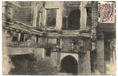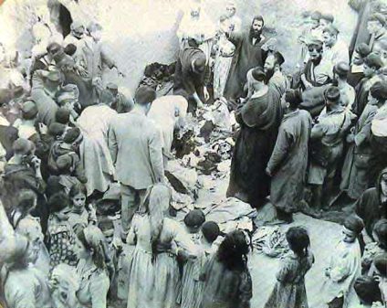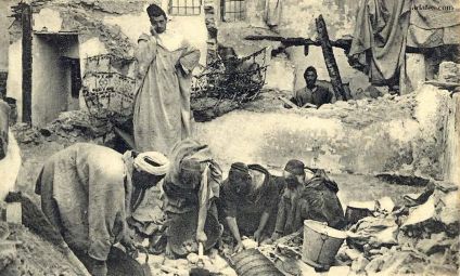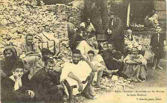 Les restes dans les décombres... Des photographies bouleversantes du drame furent diffusées dans la presse internationale mobilisant le judaïsme mondial comme au temps de l’Affaire de Damas (1840). Il est significatif que la presse sioniste ait perçu, dans le cataclysme marocain, la nécessité impérieuse d’un foyer national juif. Mais, à la différence des pogromes de Kichinev tout récents, le tritel, qui les dépassa peut-être en horreur, n’engendra pas une copieuse production littéraire. Un regard superficiel donnerait à croire que la tragédie juive de Fès a été oblitérée par les douceurs du Protectorat. Dans l’ouvrage commémoratif que vient de publier aux éditions de l’Institut Ben Zvi, Paul Fenton, professeur à la Sorbonne, montre que la persistance de cette tragédie dans la mémoire collective du judaïsme maghrébin pourrait constituer un des facteurs de l’exode massif des Juifs du Maroc au cours du XXe siècle. Débris d'une belle maison dans le quartier juif, incendiée par les émeutiers Le recul d’un siècle qui a été témoin de l’extinction des communautés juives du Maghreb, permet d’analyser avec objectivité ce chapitre douloureux de leur histoire. Son étude montre clairement les complicités machiavéliques du pouvoir chérifien et du gouvernement de Paris pour détourner la fureur inévitable de la population musulmane du colonisateur et du sultan. Enfin, ce dernier n’a pas hésité à sacrifier les plus faibles de ses sujets - la minorité juive. Des juifs réfugies dans la ménagerie du sultan côtoient les lions en cage Les juifs réfugiés dans le palais du roi Les juifs réfugiés dans le palais du roi Rue du Mellah aprés les évenements du 17 Avril 1912 Rue du Mellah aprés les évenements du 17 Avril 1912 Démunis de tout aprés les évenements du 17 Avril 1912 |