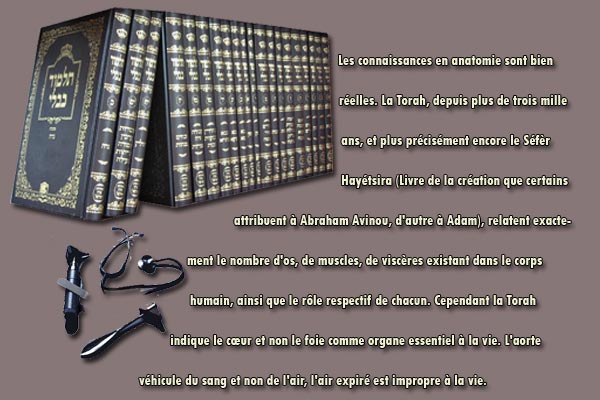 Celui-ci étant l'expression du cheminement de notre âme, il existe un ou plusieurs antidotes permettant à Dieu de nous remettre en phase avec l'équilibre de Sa création! ![]() Ce personnage a un rôle qui représente l'instrument de Dieu pour aider les hommes à réintégrer le juste cours de l'édifice de la création. Traiter un homme ne représente ni une atteinte à la volonté divine, ni une insulte, mais au contraire un devoir dicté par Dieu Lui-même. Le Talmud reflète la conception du monde du peuple juif, fondée sur la croyance en un Dieu unique, Maître de la vie sur terre et dont l'homme ne peut enfreindre la Loi. Cette attitude s'oppose à la médecine hippocratique qui accorde une importance majeure au pronostic en se basant sur la matière, qui est en fait le niveau le plus bas de la création. ![]() Comment traiter de la médecine et du patrimoine culturel juif sans parler de la Brite Mila (circoncision). La Brite Mila est donc l'acte rituel juif qui consiste en l'ablation du prépuce chez le nouveau né âgé de 8 jours chez les juifs. ![]() Chez les juifs, la circoncision n'est pratiquée QUE par un "Mohel" (spécialiste des règles de pureté inhérentes à la technique de la circoncision et elle-même). La physiologie féminine est abordée, entre autre, dans le livre de Vayikra (ch15-v19 et 25, ch20-v18), "La femme qui aura un flux de sang pendant plusieurs jours hors de ses époques régulières sera impure tout le temps comme au temps de son indisposition menstruelle." ![]() Ainsi l'hépatectomie (consiste en l'ablation de lésions malignes ou bénignes) est réputée mortelle alors que la splénectomie (ablation chirurgicale de la rate) ne l'est qu'en cas d'hémorragie massive. Certaines pathologies sont bien connues, d'autres sont redoutées. Les affections dermatologiques et génitales suscitent un intérêt particulier. Les syndromes dysentériques, les ictères, les hémorroïdes, la lithiase vésicale, la diphtérie, les psychopathies sont connues. Les piqûres d'insectes, les morsures de chiens ou de serpents sont redoutées. Les manifestations convulsives ou hystériques sont rapportées à des troubles sexuels ou à une folie nommée en terme hébraïque Roua'h Chtoute ("vent de bêtise") qui est entré dans la tête. Les "Oumanimes", étaient des chirurgiens diplômés chargés de pratiquer les saignées, les césariennes, les réductions de luxations ou de fractures, les amputations, les soins dentaires. L'analgésie (interruption de la transmission du signal neuronal de douleur depuis la zone lésée) était pratiquée avec une potion à base de mandragore dont la racine contient des alcaloïdes délirogènes: d'atropine, de scopolamine, et surtout d'hyosciamine (la "somma deschinta"). ![]() La thérapeutique médicale utilisée par les hébreux de la période biblique était singulière, de bon sens et efficace. Elle recourait à des substances animales variées et inattendues; à des plantes médicinales comme la mandragore ou le "samthar". Leur administration se faisait sous formes d'infusions, de vins, de poudres, de pommades, de collyres. Dans le livre des Rois (Mélakhim ch 4-v 33, 34, 35) on explique comment le prophète Elicha ressuscite un enfant mort des suites de céphalées (douleurs locales ressenties au niveau de la boîte crânienne): " Elicha pria l'Eternel. Il monta, se coucha sur l'enfant; il mit sa bouche sur sa bouche, ses yeux sur ses yeux, ses mains sur ses mains, et il s'étendit sur lui. Et la chair de l'enfant se réchauffa." Les prêtres de cette époque avaient des pouvoirs très puissants que nous nommerions aujourd'hui "magiques" (par pure ignorance de l'aspect hautement spirituel du message divin au mont Sinaï), et pouvaient littéralement faire revivre une personne morte! La manipulation n'a rien à voir avec une séance de bouche à bouche! Le prophète Ycha'ya dit: Prenez une masse de figues. On la prit, et on l'appliqua sur l'ulcère. ![]() Là encore, de même que pour la circoncision, il ne s'agit aucunement de règles "d'hygiène", mais bien d'un décret divin visant à restreindre le peuple d'Israël à une nourriture et à un mode de consommation idéal pour l'élévation spirituelle vers Dieu. Ces conditions ne peuvent pas être transgresser au cours de la vie d'un juif respectueux de son pacte avec Dieu. Autrement dit, respectueux des lois (Halakhote) rédigées par les plus grandes sommités halakhique de tout temps (Tanaïm, Amoraïm, Guéonim, Richonim....) et possédant une connaissance profonde du psyché humain. L'abattage rituel s'est donc toujours pratiqué chez les juifs, et le Cho'hèt spécialisé dans cette pratique, doit connaître parfaitement l'anatomie de la bête qu'il abat, selon des règles très précises et strictes énoncées par la Torah, et bien entendu la Guémara qui en est donc un des commentaires les plus pointus. Le Talmud formule un noble précepte d'objectivité: "Tu ne parleras que si la chose te paraît aussi claire que le jour". Aussi les notations médicales qui sont parfois d'inspiration vétérinaire, sont rédigées dans certains cas après avoir recouru à l'expérimentation contradictoire en cas de doute. La recherche d'une preuve pouvait même conduire à pratiquer une autopsie d'une chèvre malade. Les règles d'hygiène collective tiennent une grande place dans le Talmud. L'usage quotidien des ablutions et des bains était ordonné par la coutume religieuse.
