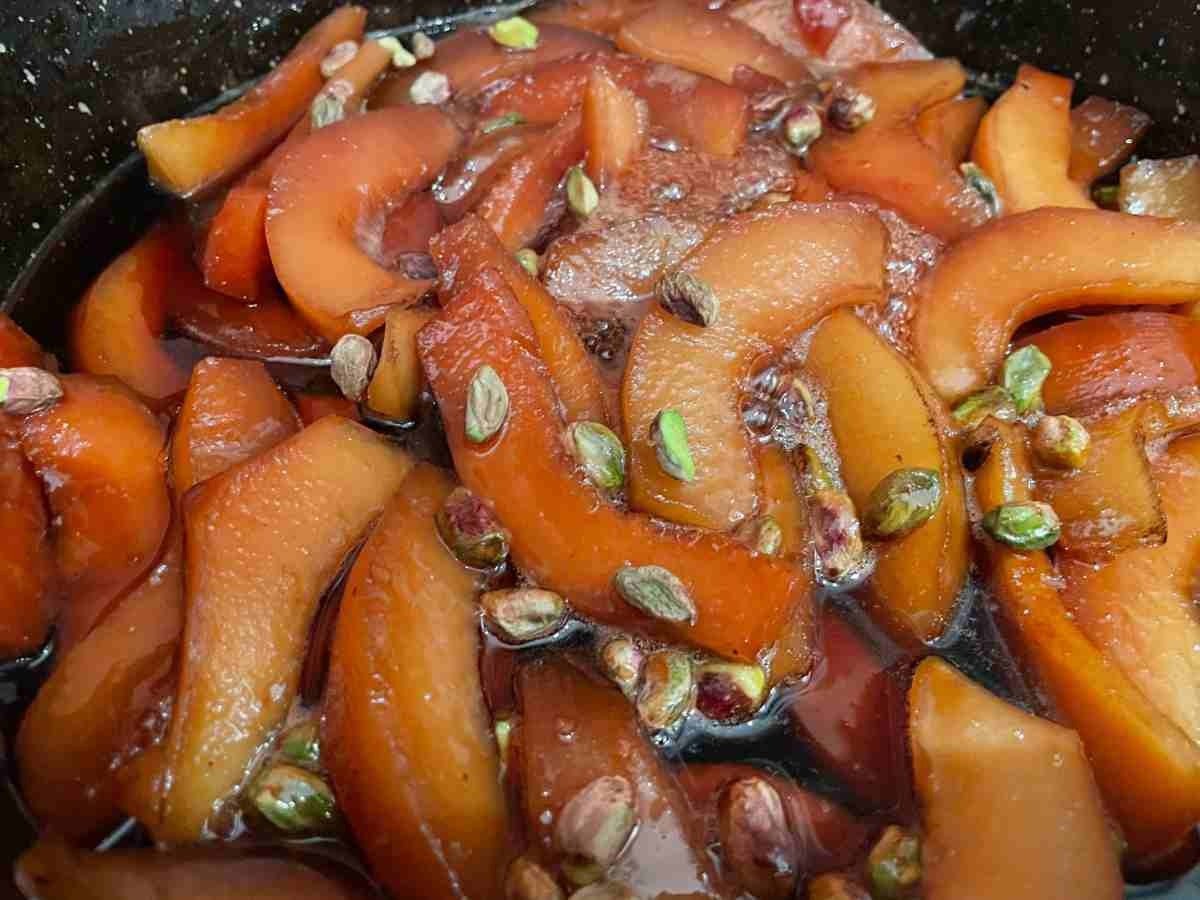 Faites cuire à feu moyen, à couvert, pendant 30min puis laissez caraméliser pendant 1h30 à feu doux, à découvert. Vous pouvez aussi ajouter des amandes ou des pistaches dans la casserole 15min avant la fin de la cuisson.
