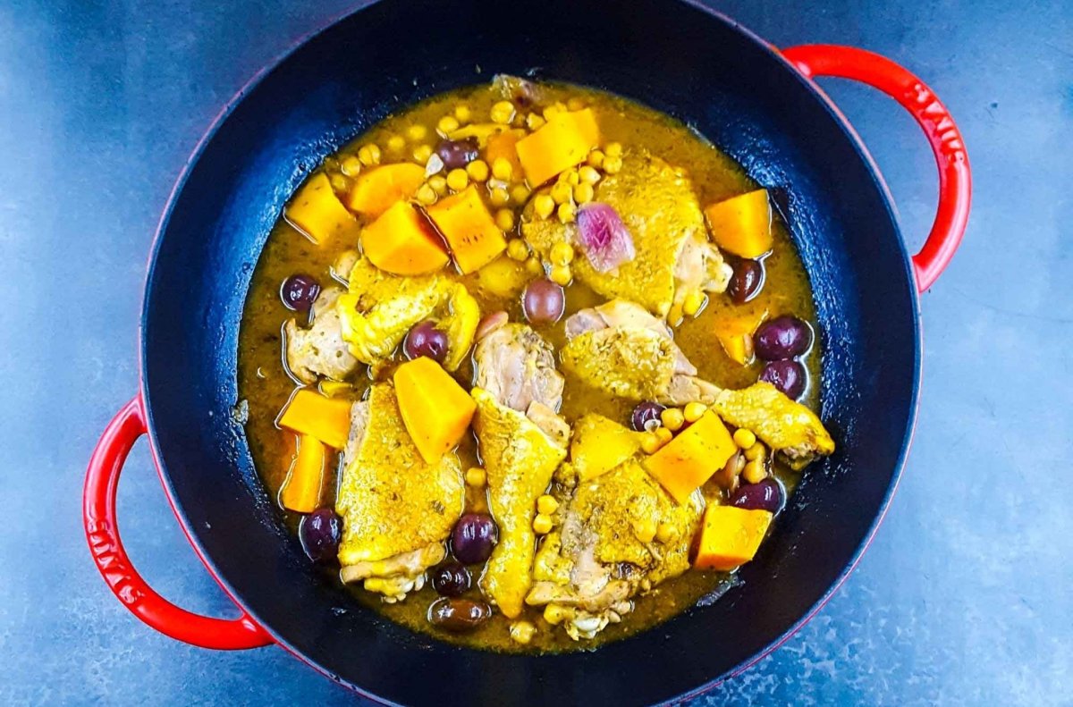 Laisser mijoter 30 minutes en remuant de temps en temps puis ajouter les pois chiches. Laisser mijoter encore 15 minutes. Goûter pour ajuster l’assaisonnement (sel, poivre, épices) mais en principe le plat est assez salé avec les olives, citron et bouillon cube.
